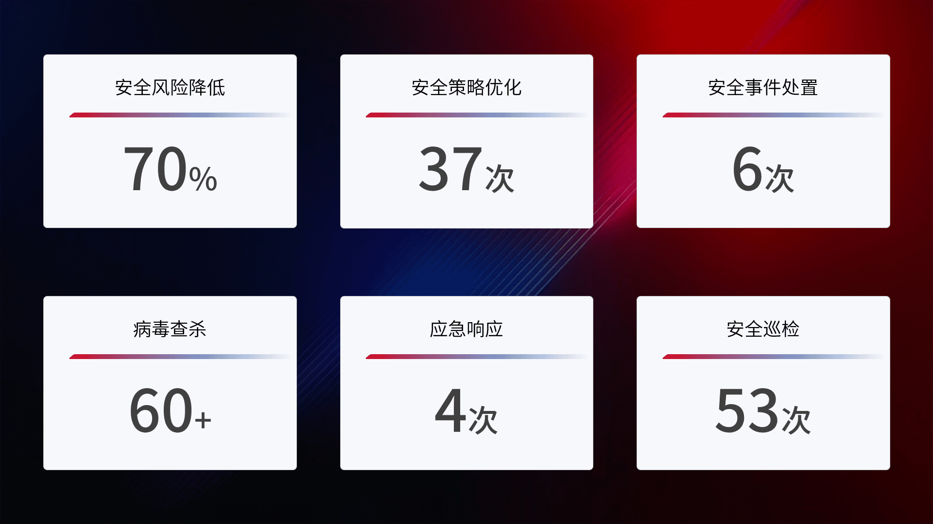 提供全面的安全事件报告体系,,,,包括处置报告、、周报、、季度和年度总结,,,结合持续监控,,帮助客户深入了解网络安全状况。。