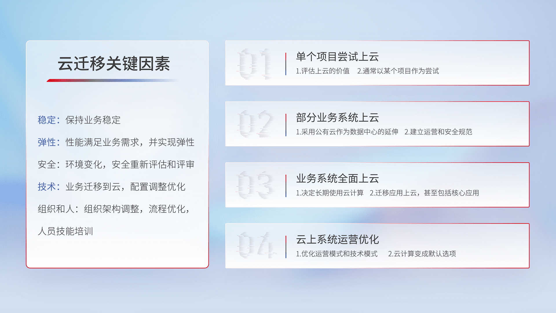 结合实际业务,,,从规划设计、、、云平台选型、、、、云原生改造、、、、数据迁移、、、集成交付,,,迁移全过程为客户识别最佳上云路径,,,,做好风险识别管理,,,,设计网络架构、、、、身份权限、、、、安全审计合规、、、、操作审计、、、日志审计、、、、监控告警策略、、、多站点容灾设计等,,对云上基础设施进行整体规划,,,,提升IT治理水平,,以满足弹性、、高可用、、高性能的需求。。。。