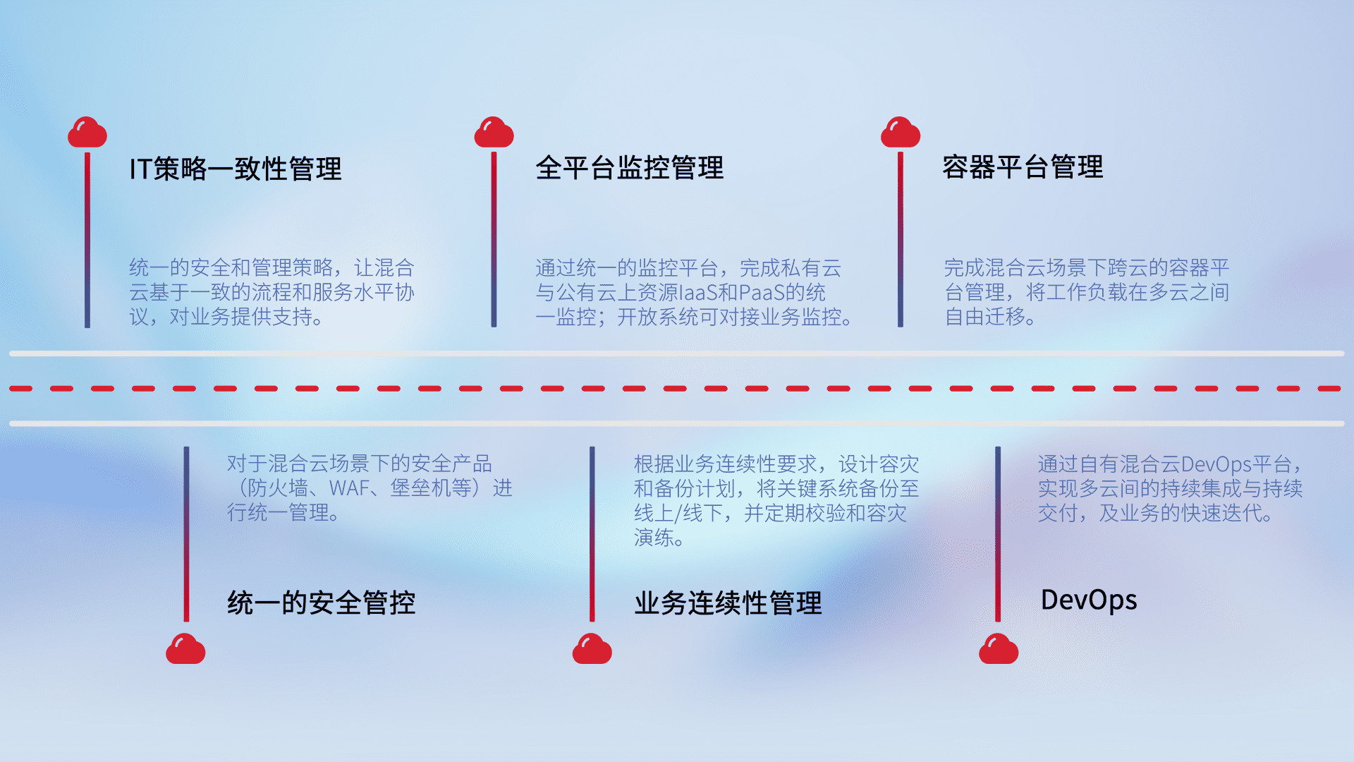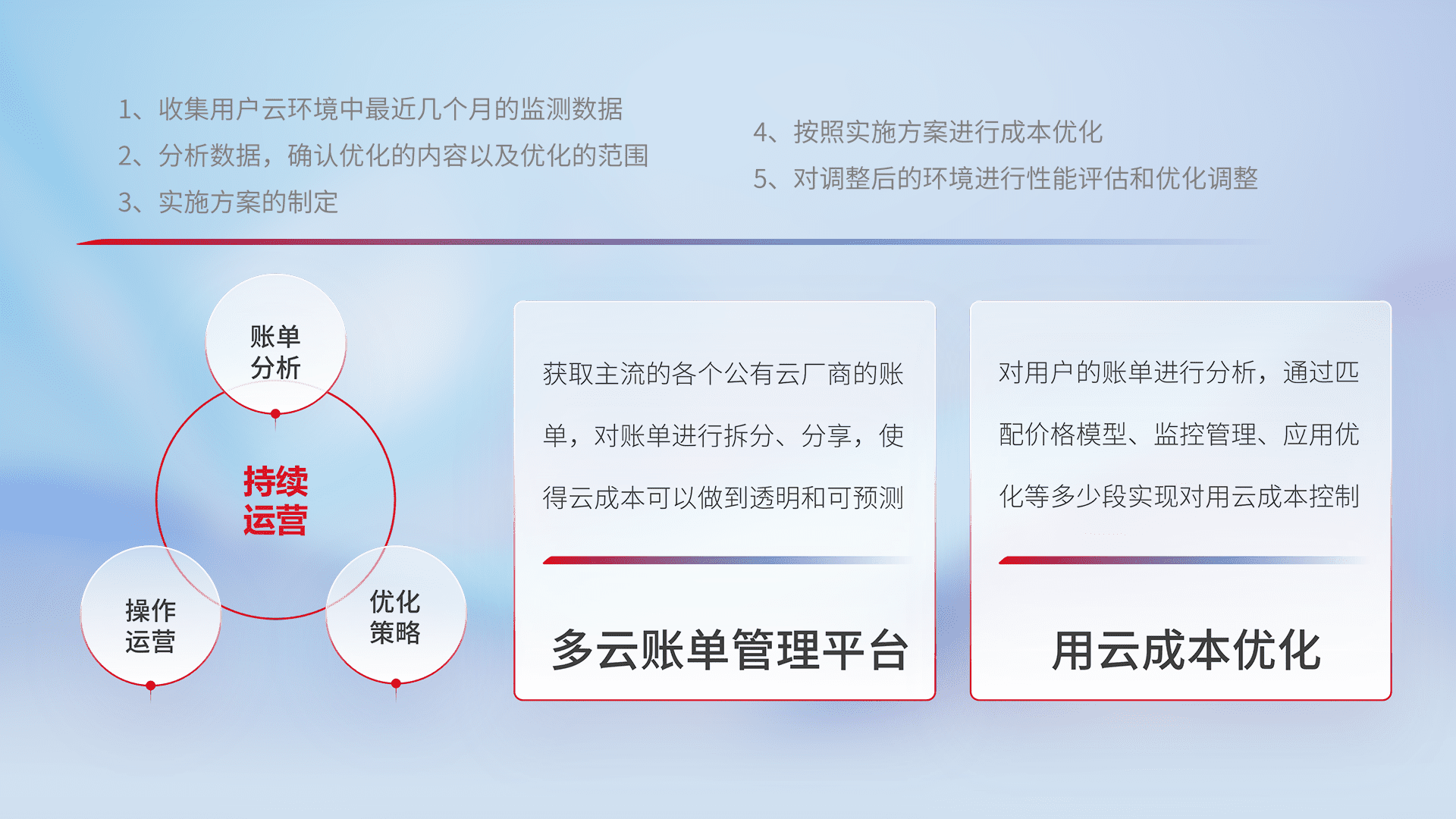 通过多云纳管,,,以统一的资源数据模型把客户的云资源进行抽象和封装,,进而实现对多云资源的统一操作,,保障云资源管理的可靠性、、稳定性与可用性。。量身定制化运维内容,,,配置、、、、开发运维、、补丁管理、、、备份、、、监控、、、、认证和访问管理、、、、审计和日常巡检等,,保障在用云过程中的可靠度,,,稳定度以及高可用率。。