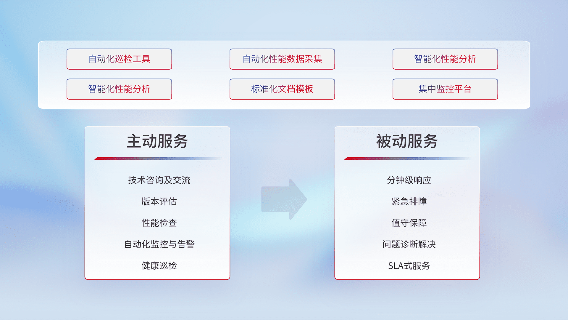 智能化工具和标准化文档,,,,保障服务质量,,提供主动服务(包含技术咨询、、版本评估、、性能检查、、、、自动化监控与告警、、、、健康巡检)和被动服务包含(分钟级响应、、、、紧急排障、、、值守保障、、、、问题诊断解决、、、SLA服务)。。。